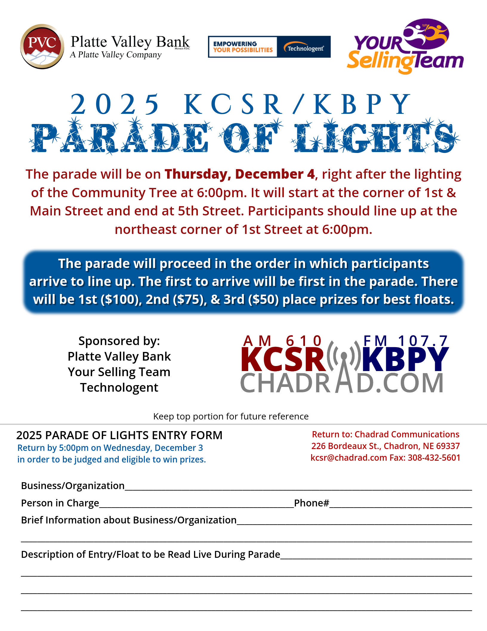 -If you are interested in donating to the cause we are working with Homestead Bank & The Chadron Community Foundation Fund to accept donations to help off-set cost for local businesses. If you are interested in donating, you may write a check to: “Chadron Community Foundation Fund”, Memo Line: Christmas Lights Donation and give to Kali Cotton at 308 Nutrition or Gabby Kreis at the Chadron Chamber.