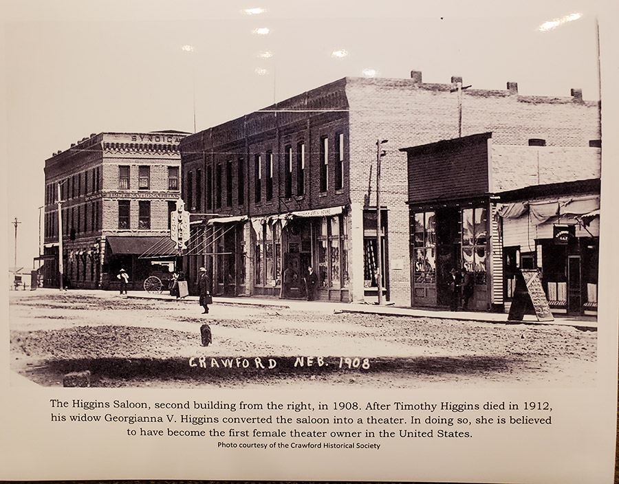 A flintknapping display, for example, reveals the tools used and skills exhibited by early humans in their effort to communicate and survive. Another is dedicated to the Elite Theatre in Crawford, owned by Timothy and Georgianna Higgins in the early 1900s. The couple first operated a saloon and added the theatre in 1909. When Mr. Higgins died in 1912, it is believed that Mrs. Higgins became the first woman in the U.S. to own and operate a moving picture theatre, according to research provided by the Crawford Historical Museum. The theatre showed its first talkie in 1930, and Mrs. Higgins retired not long after that, but first constructed a new theatre building.